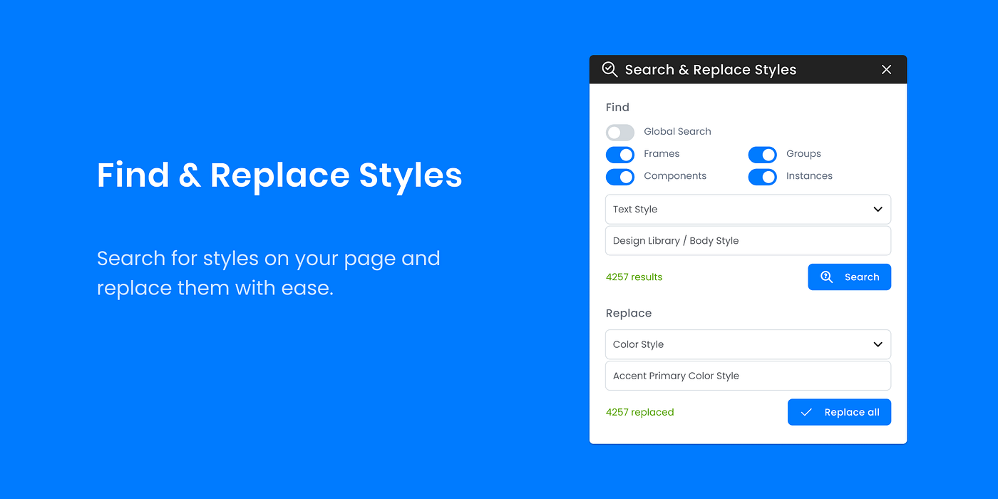 The Find and replace styles plugin is essential for maintaining consistency across your designs. It enables you to find and replace styles across components and library styles efficiently, ideal for bulk-aligning parameters such as auto layout or library styles, ensuring uniformity and precision in all your projects.
